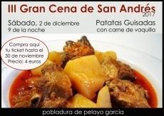 Mañana sábado la tradición abrirá la agenda con la celebración de la misa en honor al patrón, será a las 13:00 horas. Por la tard, a partir d elas 18:00 horas en el Centro Cultural Cámara Agraria, los más pequeños podrán entretenerse con un parque infantil con hinchables. Ya por la noche será momento de una animada cena de hermandad de San Andrés a base de patatas guisadas con carne de vaquilla. Después habrá verbena amenizada por la Orquesta Sonido y DJ Tino.