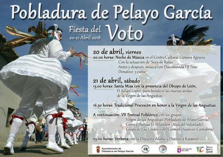 Pobladura de Pelayo García está de fiesta este fin de semana. El pueblo celebra la Fiesta del Voto y la agenda festiva ya arrancó ayer por la noche con la actuación del grupo Ecos de la Hysteria. Hoy tendrá lugar el día grande, cuando sea el acto más representativo de las fiestas con la tradicional procesión en honor a la Virgen de las Angustias con el baile de los danzantes de la localidad.