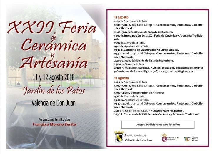 Los oficios artesanales brillarán este fin de semana en Valencia de Don Juan. La localidad acoge la vigésimo segunda Feria de Cerámica y Artesanía, un evento en el que participará un selecto grupo de artesanos que ofrecerán sus creaciones y obras en el escenario ferial estival por excelencia: el Jardín de los Patos. El Ayuntamiento ha preparado un variado programa de actividades para todos los públicos que se desarrollarán en el marco de esta Feria.