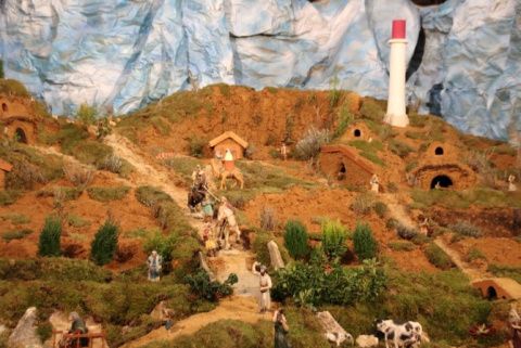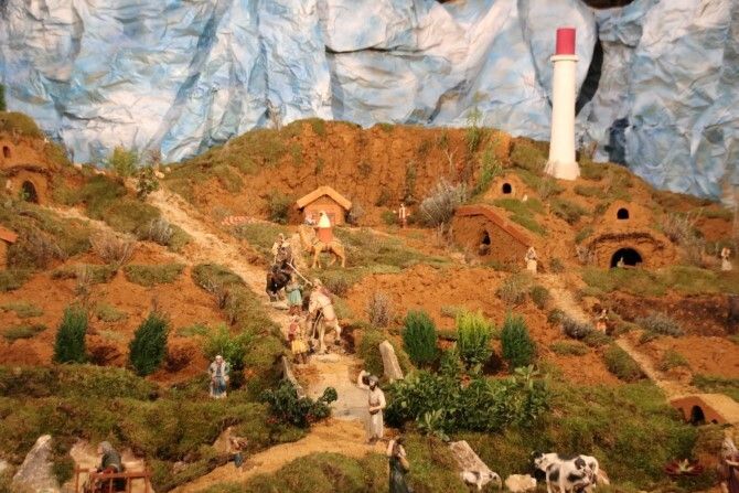 Este año el Belén está representado en el pórtico de la ermita de la Zarza. Ahí, María, José y el niño Jesús. Pastores y labriegos en las laderas de las bodegas -que aparecen representadas con todo lujo de detalles- y en lo alto la característica chimenea de Villamañán. Por el camino llegan los Reyes Magos que están a punto de cruzar el regato donde también se ven los puentes. Y escondido entre la maleza... el típico cagón.