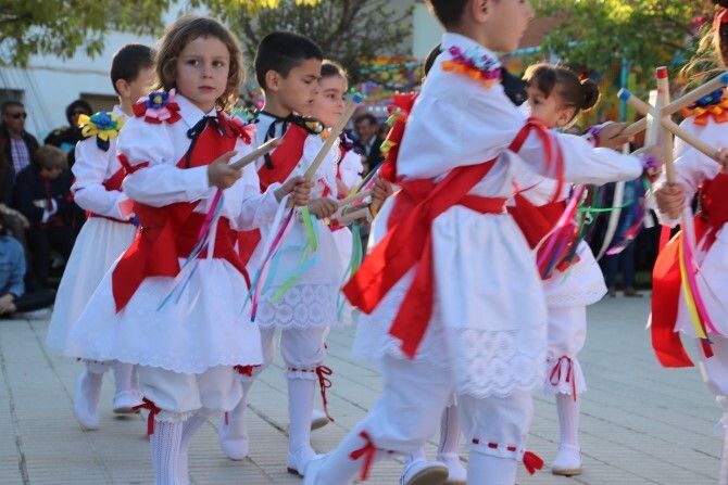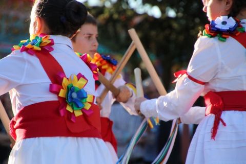 Con sus faldas blancas almidonadas, cintas de colores y flores en la espalda los jóvenes danzantes mostraron que en esto del paloteo aún tienen mucho que hacer. El esfuerzo de los ensayos con Esther, Sonia y Elena fue recompensado con aplausos que los jóvenes danzantes recibieron con tímidas sonrisas. Además de los danzantes el grupo estuvo compuesto por las niñas que portaban el estandarte, los dos tamborileros y una pequeña que vestida de danzante aún no toca el paloteo. En Cabreros cuentan hasta con dulzaina y los músicos que pusieron el ritmo también son locales.