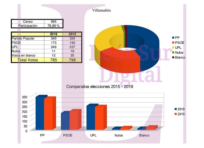 Resultados idénticos al 2015 en Villamañán. El PP gana con cuatro ediles que son insuficientes para gobernar. UPL obtiene tres concejales y el PSOE dos. Salvo sorpresa mayúscula todo apunta a que el modelo de gobierno UPL-PSOE se repetirá en este municipio.