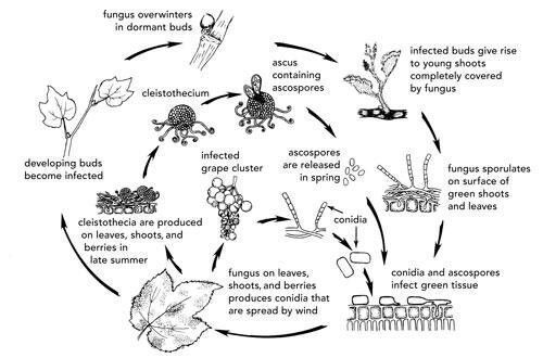 Ataque temprano: cuando el hongo ataca desde prefloración hasta unos 20-30 días después de haberse producido la misma. Las bayas se presentan pequeñas, duras (por formación de tejido cicatrizal y corchoso que trata de evitar el progreso del hongo) y se cubren con una pulverulencia blanco-grisácea abundante que es el cuerpo del hongo. Tanto la semilla como la pulpa siguen creciendo y como la baya ha perdido elasticidad, termina por rajarse quedando expuesta al ataque de otros parásitos.