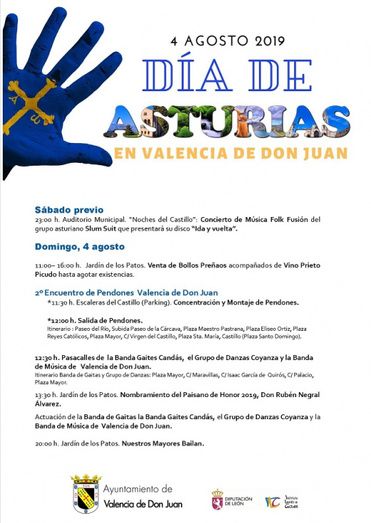 Asturias tiene su día en Valencia de Don Juan cada verano. Una fiesta que lleva celebrándose desde 1975 en un homenaje a los veraneantes "más fieles": los asturianos. El Día de Asturias este año tendrá lugar el domingo 4 de agosto, con un programa repleto de actividades entre las que no faltará el folklore, tanto local (Grupo de Danzas Coyanza) como Asturiano (Grupo de Gaites de Candás).