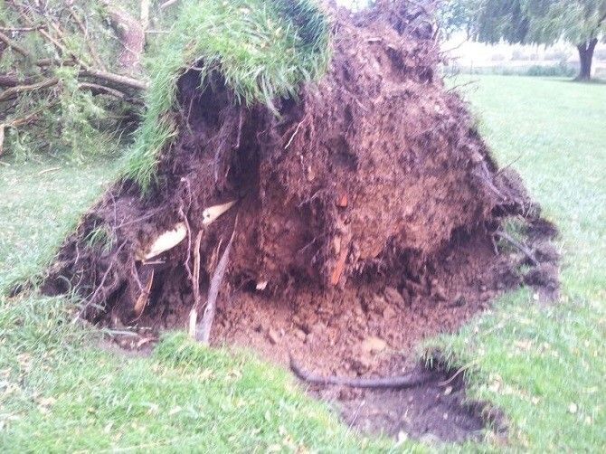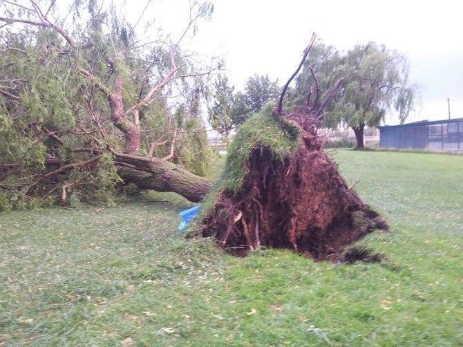 En las piscinas municipales de la localidad, los usuarios observaron asombrados como el viento arrancaba de 'cuajo' este árbol.