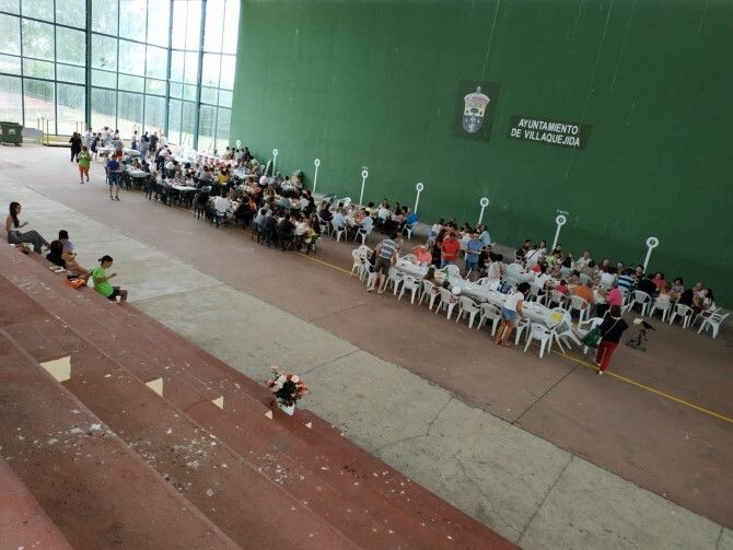 Ciento sesenta personas participaron en la comida popular celebrada ayer en el frontón de Villaquejida. Organizada por la Asociación Cultural El BIendo, la comida ―patatas con costilla más postre, más rosquillas, más café, más chupito― estuvo a la altura a la que ya nos tiene acostumbrados el Grupo de Cocineras del pueblo. “Riquísima”, era el unánime comentario, corroborado con una calurosa ovación en el momento de los brindis.