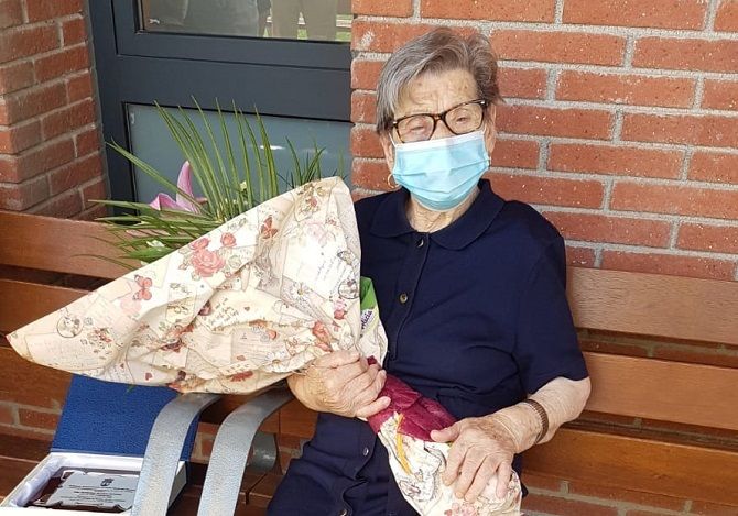 Florinda Blanco Alvarez tiene 100 años y ayer fue homenajeada por el Ayuntamiento de Santa María del Páramo. Cumplió los 100 unos días antes de decretarse el Estado de Alarma, el 7 de marzo. Este lunes representantes de la corporación local y la propia alcaldesa, Alicia Gallega, ayer hicieron entrega de una placa conmemorativa (ya encargada en marzo) para recordar tan importante día. Florinda recibió con una sonrisa la placa y un ramo de flores.