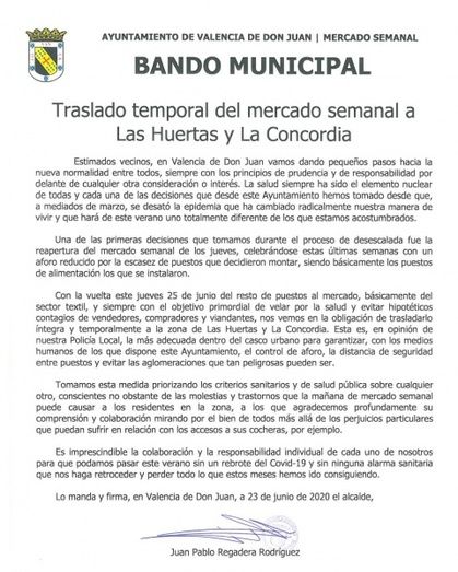 El mercado de los jueves de Valencia de Don Juan traslada su ubicación. A través de un bando, el Ayuntamiento ha hecho publica esta iniciativa que pretende ofrecer más seguridad y distancia social en la "nueva normalidad". A partir de mañana jueves, el mercado semanal abandona su tradicional ubicación de la Plaza Mayor para trasladarse a la calle Las Huertas y plaza de La Concordia.