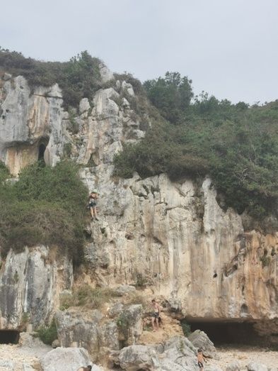 Una de las curiosidades de esta playa es que los bañistas pueden observar desde sus propias toallas como los escaladores suben las vías preparadas en las rocas que rodean la playa en su lado izquierdo. En la zona está habilitada una Escuela de Escalada (así se conoce a la zona habilitada para escalar) por lo que es frecuente ver a escaladores con cuerdas, mosquetones, pies dega gatos y cintas express.