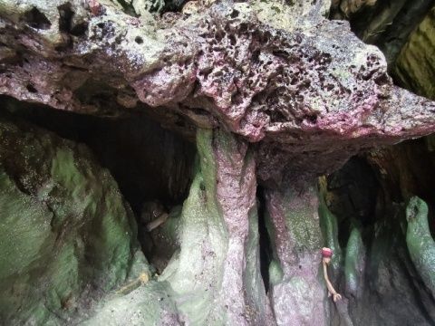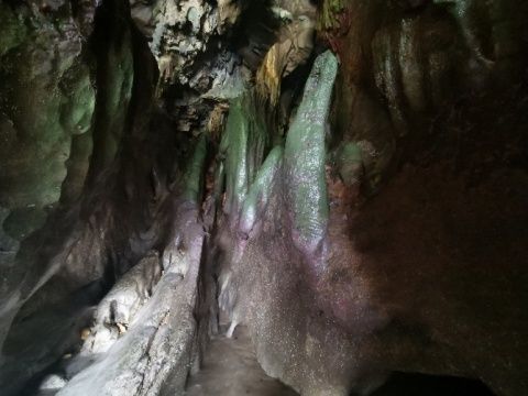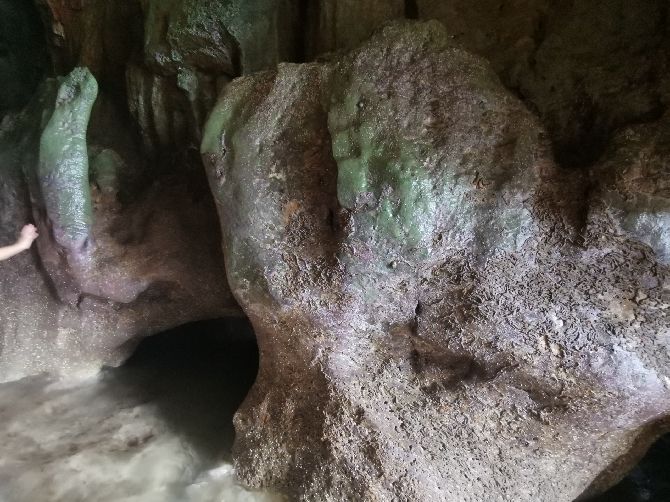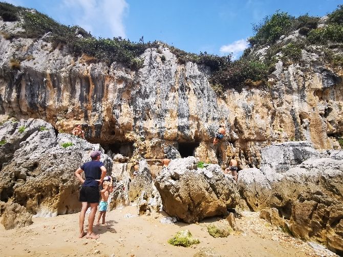 Las cuevas que rodean la playa en un paísaje kárstico de inigualable belleza dan nombre a esta playa de arena fina. En el momento en el que la marea baja quedan al descubierto cuevas, pasadizos, arcos y figuras horadadas en la roca por el mar. Negros, marrones, grises y morados contrastan con el agua que, en algunos puntos, brilla de color turquesa.
