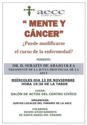 Una charla sobre el cáncer tendrá lugar esta tarde, a las 19:30 horas, en el salón de actos del Centro Cívico de Santa María del Páramo. El doctor Serafín de Abajo (presidente de la Junta Provincial de la AECC) será el encargado de impartir la charla bajo el título '¿se puede modificar el curso de la enfermedad?'.