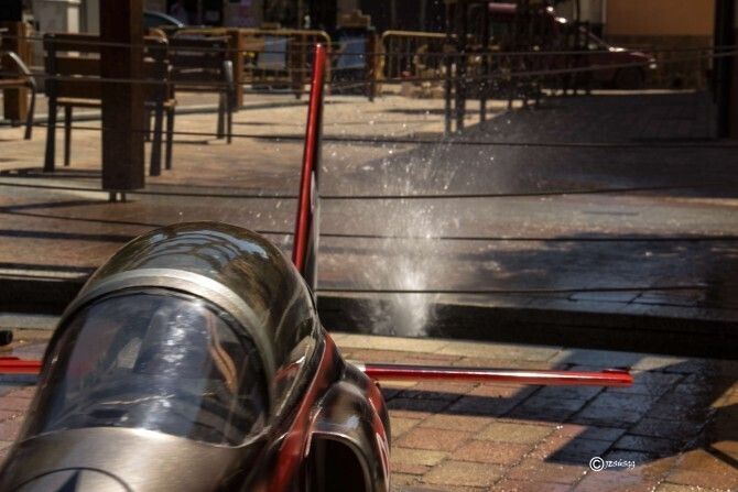 De entre todos los aviones el que más expectación causó fue el reactor. Cuando el piloto arrancó sus motores y el aire de las turbinas desplazó el chorro del agua de la fuente de la plaza varios metros... todo un espectáculo.