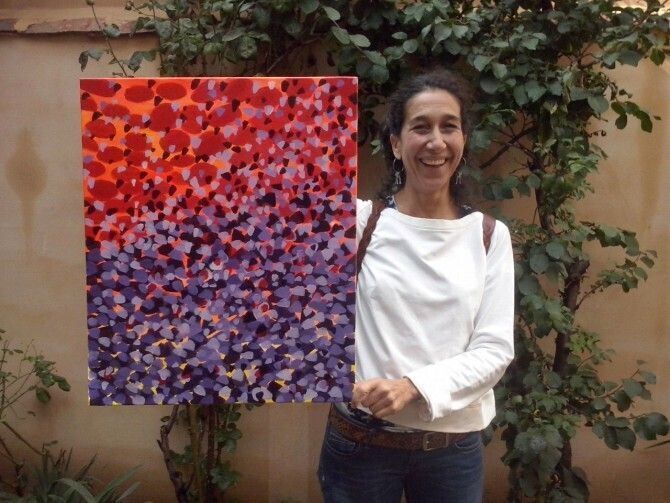 La artista aplica en sus obras diferentes tendencias, algunas de ellas en la línea de las pinturas de corte repetitivo que recuerda a las realizadas por las tribus de Iquitos en Sudamérica.