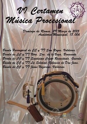 La Cofradía de Jesús de Nazareno de Valderas organiza mañana, Domingo de Ramos, la sexta edición del Certamen de Música Procesional de Valderas. En la cita valderense participarán cinco bandas. A la banda de CC y TT de la cofradía de Jesús Nazareno de Valderas le acompañarán la Banda de San Roque de Valderas, la banda Nuestra Señora de la Vega de Benavente (Zamora), la del Santísimo Cristo Resucitado de Guardo (Palencia) y la banda de La Soledad de Valencia de Don Juan.
