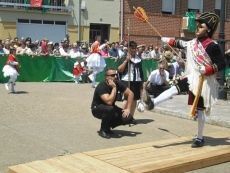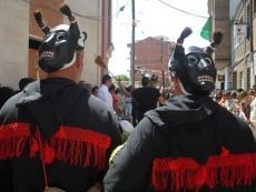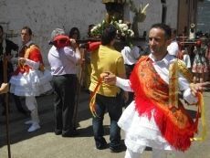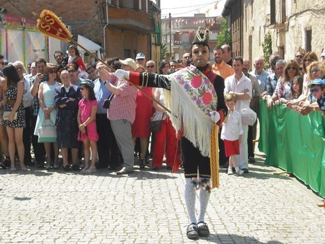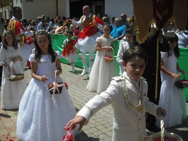 año a cientos de personas. En esta celebración cuyo origen se remonta a un antiguo Auto Sacramental se mezcla lo religioso y lo pagano y escenifica la conversión de un arrogante bandido al que el pueblo identifica con San Sebastián. Este personaje, que es el central de la fiesta, abre la procesión con caminar enérgico y singular, ataviado como Napoleón y luciendo una mantilla española sobre el uniforme militar. San Sebastián con paso singular, va retando a la Iglesia y dando la espalda al Santísimo Sacramento. No va solo, le siguen los apóstoles (menos Judas Iscariote), todos vestidos como tales y portando sus atributos, así como los danzantes vestidos de blanco y con faldas almidonadas que emulan a los ángeles bailando durante todo el recorrido al son del tambor y la dulzaina, mientras los birrias (personajes que representan al diablo) abren paso a la procesión que complentan abades de las cofradías, imágenes, fieles, estandartes, niños de Primera Comunión y la Custodia junto a las autoridades bajo Palio.