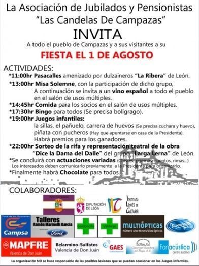 Campazas hoy festeja la Fiesta de los Jubilados y Pensionistas con una intensa jornada llena de actividades organizadas por la asociación Las Candelas de Campazas con la colaboración del Ayuntamiento, la Diputación, el Instituto Leonés de Cultura y diversos patrocinadores.