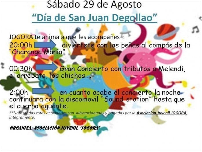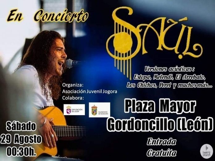 Después, gracias a la asociación Jogora, a las ocho de la tarde llegará el ritmo de la Charanga Manía que animará a todas las peñas y vecinos con sus pegadizos comparses. Jogora también presentará el gran concierto del sábado noche que será un tributo a figuras como Melendi, El Arrebato, Los Chichos...hasta el escenario gordoncillés llegará Saúl que ofrecerá versiones en un acústico con mucha fuerza. Será a partir de las doce y media de la noche. Al acabar el concierto de Saúl será el turno de la discomóvil Sound Station. La fiesta continuará hasta que el cuerpo aguante.