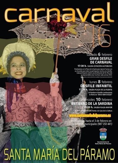 El Ayuntamiento de Santa María del Páramo ha presentado el cartel del Carnaval 2016 que tendrá lugar entre los días 6 y 10 de febrero. El acto principal será el gran desfile de Carnaval que tendrá lugar el sábado 6 de febrero a partir de las 17:30 horas.