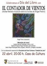 La Casa de Cultura de Valencia de Don Juan será escenario esta tarde de la celebración del Día del Libro en la localidad. Para la ocasión está previsto un espectáculo integrado por un recital literario-musical sobre la novela de Ángel Fierro, El Contador de Vientos. La actuación será interpretada por Lorena García Fernández, Daniel Fernando Rojas y Jesús Ángel Rodríguez Recio, integrantes de la formación musical Ministreles del Vientos, y el propio autor que ejercerá de narrador. Esta representación contará con la colaboración especial de la Escolanía de Pueri Cantores Catedral de León, dirigida por Daniel Fernando Rojas Restrepo.