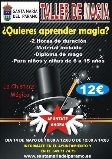 La jornada del sábado además contará con un Taller de Magia dirigido para niños de 6 a 15 años. Durante dos horas los pequeños podrán descubrir los mejores trucos de los magos y a experimentar la magia en sus propias manos. Al finalizar, los integrantes del taller -que contarán con todo el material necesario- recibirán un diploma de mago. El taller se desarrollará en dos horarios de mañana y tiene un precio de 12 euros. Más información en el Ayuntamiento y en el teléfono 649 71 74 79.