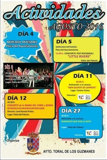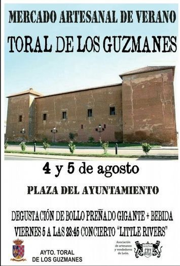[Img #23765]Toral de los Guzmanes inaugura hoy su agenda de ocio para el mes de agosto. El patio del Palacio de acoge, hoy y mañana, un mercado artesanal que ofrecerá artesanías y cerámicas a todos los visitantes que podrán disfrutar de la artesanía más destacada. Alrededor de este mercado tendrá lugar una serie de actividades paralelas, como la degustación de bollo preñado gigante más bebida y un concierto de a cargo de Little Rivers mañana viernes a las 23:45 horas.