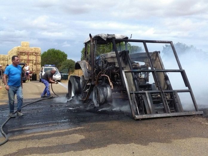 El incendio de un tracto en la carretera que une Campazas con Valderas (LE:8602) ha provocado el corte de esta vía. El suceso se ha producido pocos minutos después de las 13:40 horas cuando el vehículo -que transportaba fardos de paja- ha comenzado a arder -por la cabina- por causas que aún se desconocen.