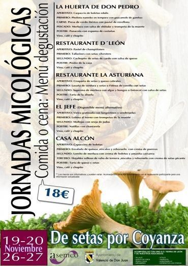 'De setas por Coyanza' es la propuesta gastronómica para los próximos fines de semana en Valencia de Don Juan. La localidad acogerá estas jornadas gastronómicas los días 19, 20, 26 y 27 de noviembre. En la iniciativa, organizada por la asociación empresarial Asemco con la colaboración del Ayuntamiento de Valencia de Don Juan, participan cinco restaurantes que ofrecerán un menú degustación por 18 euros.