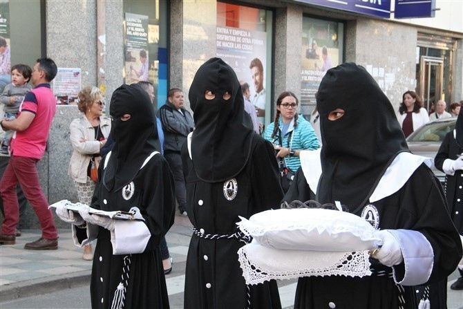 Abre la procesión una cruz seguida de los símbolos de La Pasión: clavos y corona de espinas.