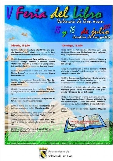 La Feria del Libro de Valencia de Don Juan tendrá lugar el próximo fin de semana, 15 y 16 de julio. Durante estos días, el Jardín de los Patos se convierte en foco de cultura a través de los libros, presentaciones literarias, charlas con los autores y otras actividades de corte cultural. Editoriales, librerías y escritores participarán en esta cita con sus obras y sus libros, en total casi una veintena de profesionales –llegados de Guadalajara, Madrid, Badajoz, todo Castilla y León…- contarán con stands.