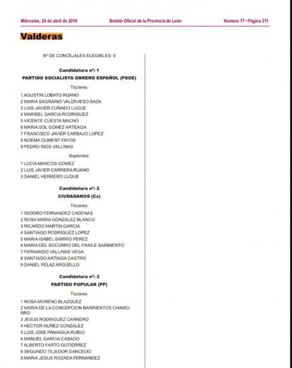 David Martínez Crespo y Juan Manuel Crespo Escudero se presentan por la Agrupación de Fuentes de Carbajal; Tomás Mateos Magdaleno y Ana Fe Fernández Aller por el PSOE; Lidio Ceruelo de la Fuente y Eduardo Ortega de la Fuente por Ciudadanos; y Marta Tre Cuervo por UPL.
