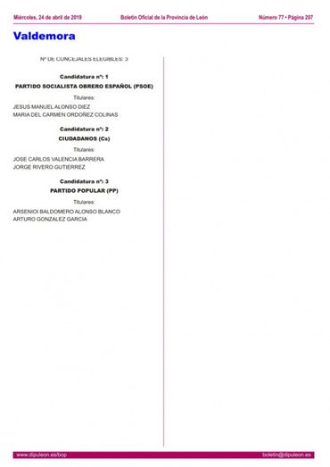 Este miércoles 24 de abril el Boletín Oficial de la Provincia ha publicado las listas de los candidatos para las próximas elecciones municipales que tendrán lugar el 26 de mayo. Destaca el amplio número de candidaturas en municipios que hasta el momento tan solo contaban con dos candidaturas (PP y PSOE) y en algunos casos UPL que ya amplio su presencia en los municipios en las pasadas municipales del 2015.
