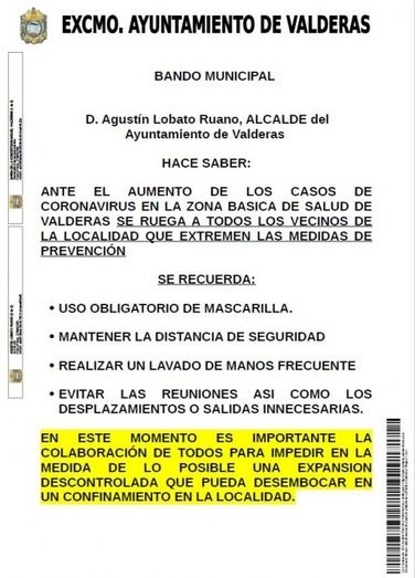 En Valderas, donde no se ha dejado de desinfectar las calles y plazas desde el inicio de la pandemia, el alcalde ha emitido un bando donde "ruega" a todos los vecinos que extremen las medidas de prevención y evitar las reuniones así como los desplazamientos o salidas innecesarias.
