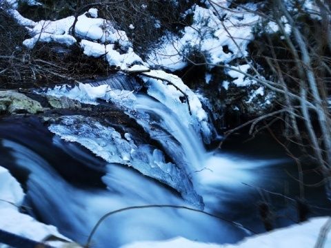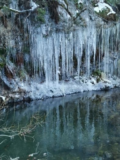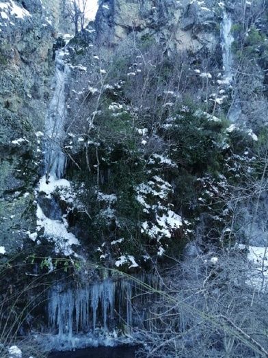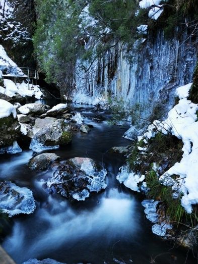 El agua continúa saltando, la fuerza del arroyo es brutal. Los carámbanos adornan cada rincón del barranco teñido de blanco que se convierte en un auténtico congelador.
