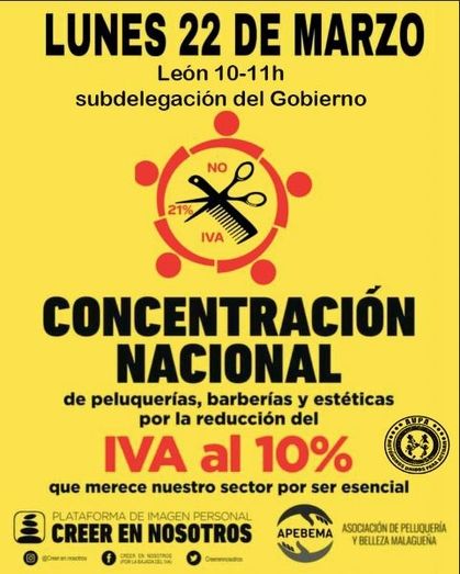 Hoy lunes, 22 de marzo, AUPA (Autónomos Unidos para Actuar) y Plataforma de imagen Personal Creer en Nosotros han convocado una nueva jornada para reclamar la bajada del IVA al 10%. La convocatoria es en frente de la Subdelegación de Gobierno de León a las 10:00 horas.