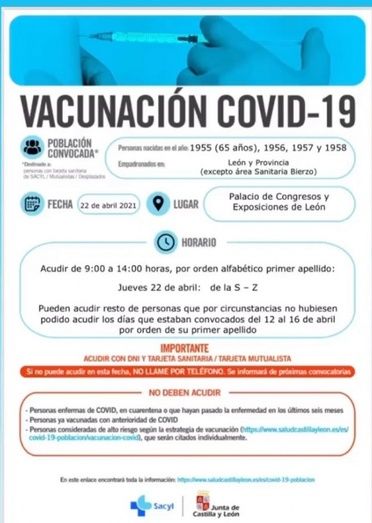 - También del 27 al 30 de abril y también en el Palacio de Exposiciones se convoca a los nacidos entre 1942 y 1948 de la zona básica de salud de Condesa, Crucero, Armunia, Trobajo del Camino (excepto Valverde), San Andrés del Rabanedo (excepto pueblos). De 9 a 14 horas, se cita por día y orden alfabético del primer apellido: