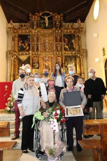 El acto homenaje tuvo lugar ayer, después de la celebración religiosa dominical. Elisa estuvo acompañada de dos de sus hijas y parte de su familia. Su otro hijo, que reside en Barcelona, no pudo acudir.El Ayuntamiento la entregó una placa conmemorativa y recibió como presente un ramo de flores desde la Asociación de Jubilados local.