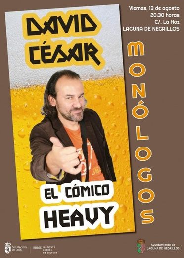 La agenda de ocio de Laguna de Negrillos continúa este fin de semana con dos nuevas citas. Para hoy viernes, 13 de agosto, está prevista la actuación de David César, 'El Cómico Heavy', con una desternillante sesión de monólogos. Será a partir de las 20:30 horas en la calle La Hoz.