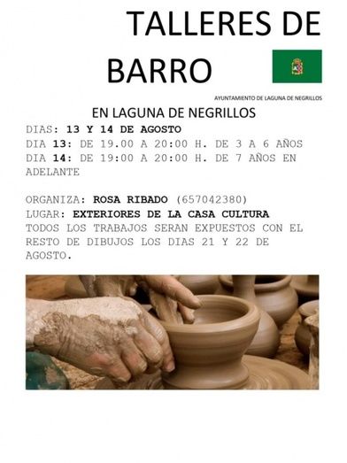 También este fin de semana está previsto unos talleres de barro. Serán hoy y mañana. Esta tarde de 19:00 a 20:00 horas será para niños de 3 a 6 años y mañana, en el mismo horario, para niños mayores de 7 años en adelante. La actividad está organizada por Rosa Ribado y se realizará en los exteriores de la Casa de Cultura. Todos los trabajos serán expuestos los días 21 y 22 de agosto.