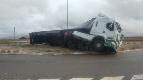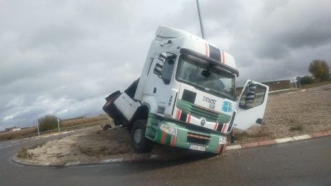 Un camión de gran tamaño acaba de volcar (14:00 horas) en la rotonda de entrada a Toral de los Guzmanes desde Algadefe en la carretera N-630. Precaución. Van a cortar la carretera en estos instantes.