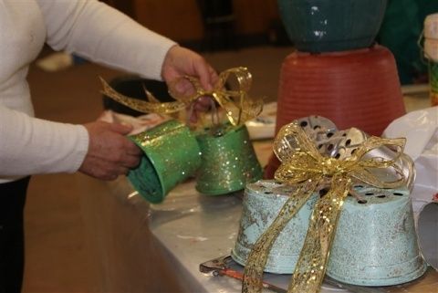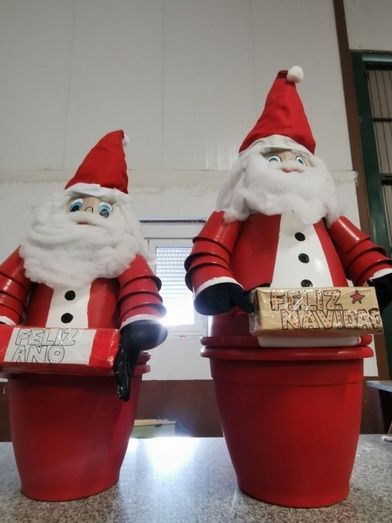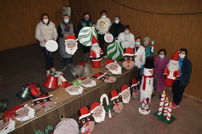 Durante semanas las manos de Tere, Chon, Camino, Cruz, Marga, Demetria, Toñi, Camino (mandre), Sari, Justi, Conchi, Begoña, Susana y Conchi han ido creando con ilusión pieza a pieza estos elementos, con tubos, tiestos, cubos, botellas y todo tipo de envases. Después de elaborarlos los han decorado y los han pintados con vivos colores para dar vida y color a la Navidad.