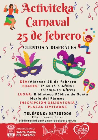 El viernes 25 también habrá en la biblioteca una Activiteka de Carnaval con cuentos y disfraces en dos horarios, a las 17.30 (de 3 a 5 años), y a las 18.30 horas (de 6 a 10 años). Una actividad gratuita pero que requiere inscripción obligatoria en la biblioteca de lunes a viernes de 16.00 horas a 20.30, en el teléfono 987351006.