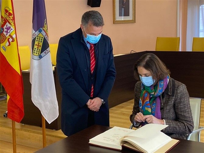 La ministra de Industria, Comercio y Turismo, Reyes Maroto, ha visitado hoy Valencia de Don Juan para interesarse por los proyectos en los que actualmente trabaja el Ayuntamiento coyantino como son la ampliación del Polígono Industrial El Tesoro y la musealización de la Casa-Palacio de los Ortiz. Ambas iniciativas se encuentran “alineadas” con la cartera que dirige Reyes Maroto puesto que, tal y como destacó la ministra del Gobierno de España, responden a los objetivos marcados para atraer fondos europeos del Plan de Recuperación, Transformación y Resiliencia. A su favor juega también el ser ideas concebidas para promover el desarrollo económico del medio rural favoreciendo el asentamiento de población, un aspecto que es sin duda esencial en la actual hoja de ruta del Gobierno de España.