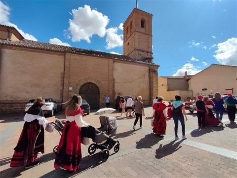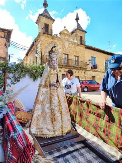 Romeros, ataviados con trajes tradicionales, acompañaron a la Virgen en su trayecto hasta la romería, primero recorriendo el pueblo desde Santa María hasta el Arco Santiago ("puerta de salida" natural de la villa) y después en cocche en comitiva hasta el Otero emulando los tiempos en los que este recorrido se hacía con mulas.