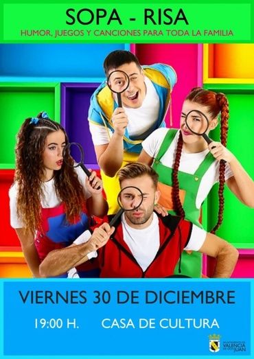 Se trata del grupo musical y de teatro infantil Sopa-Risa, conocidos entre el público más pequeño por sus divertidos espectáculos y la interpretación de un espectáculo para toda la familia, ya que las historias que cuentan están llenas de humor, juegos y canciones, que harán que los asistentes pasen un buen rato a la par que los niños aprende cosas tan importantes como los colores, el valor de la amistad o la importancia del deporte, entre otras.