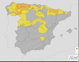 Prácticamente todo el país está en alerta por temporal. En León, en la meseta, el riesgo es amarillo por fuertes vientos para hoy que pueden alcanzar los 70 kilómetros hora. En la Cordillera Cantábrica el riesgo también se amplía a fuertes lluvias (se pueden acumular hasta 40 mm en 12 horas. Mientras que en El Bierzo el riesgo se limita a las fuertes lluvias.