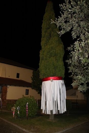 Gracias a la creatividad y a la imaginación de este grupo, el esbelto ciprés se ha transformado en un gnomo de Navidad.