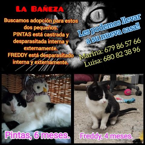 Desde La Bañeza, Pintas y Lula buscan un hogar. Son dos gatitas que desean una familia. Pintas ya está castrada, ambas están desparasidas interna y externamente. Son muy cariñosos y buscan un hogar donde ser felices y dar cariño. Están en La Bañeza. Más información Marina: 679 86 57 66 y Luisa 680 82 38 96