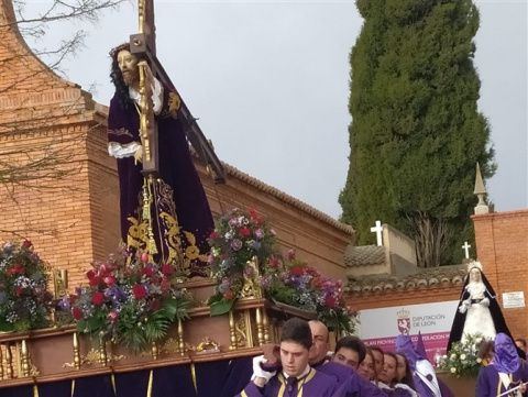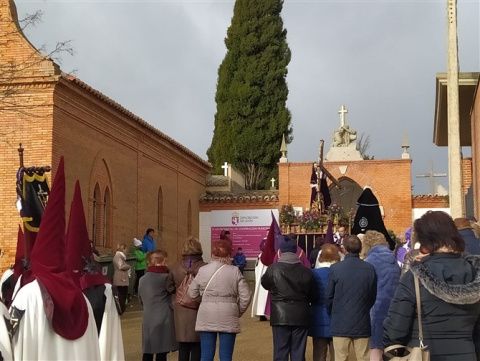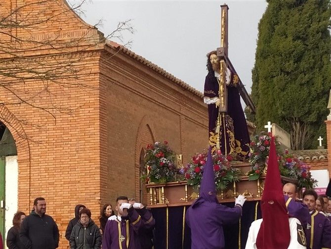 La comitiva por el camino de las cruces que lleva hasta el cementerio municipal es abierta por los cofrades de la Vera Cruz, sigue Jesús Nazareno portado a hombros por cofrades de Jesús Nazareno. También la imagen de la Virgen y miembros de la cofradía del Carmen.