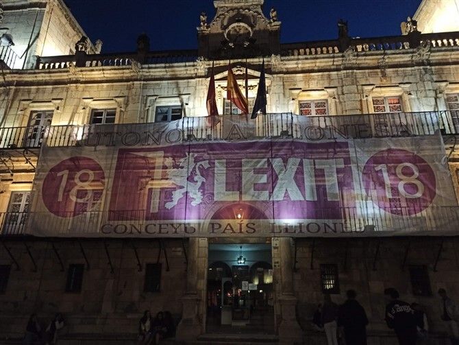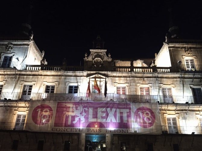 Conceyu País Llionés ha colocado como en años anteriores la pancarta "LEXIT Autonomía Leonesa" en los balcones de el edificio del Ayuntamiento en la Plaza Mayor de León.