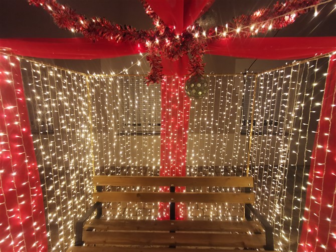 Justo delante del bar el mejor lugar para un photocall. Un gran regalo luminoso envuelve un banco en el que se puede sentar todo aquel que quiera inmortalizar su visita a un pequeño pueblo que se ha transformado en un veradero cuento de Navidad.